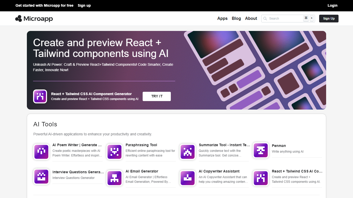 Experience a new era of component creation with Microapp.io, the ultimate platform designed for React and Tailwind CSS enthusiasts. Our innovative AI-powered tool streamlines the process of crafting and previewing components, empowering developers to code smarter and increase productivity. With a commitment to enhancing the developer experience, Microapp.io harnesses AI to provide a seamless design-to-code workflow. By integrating with Tailwind CSS, developers can rapidly prototype and iterate on stunning UI components. Stay connected with our engineering newsletter and join a community of like-minded professionals. Our user-centric platform, meticulously constructed by a Senior React Developer, strives to ensure your projects are cutting-edge and efficient. Dive into the future of component generation with Microapp.io today.