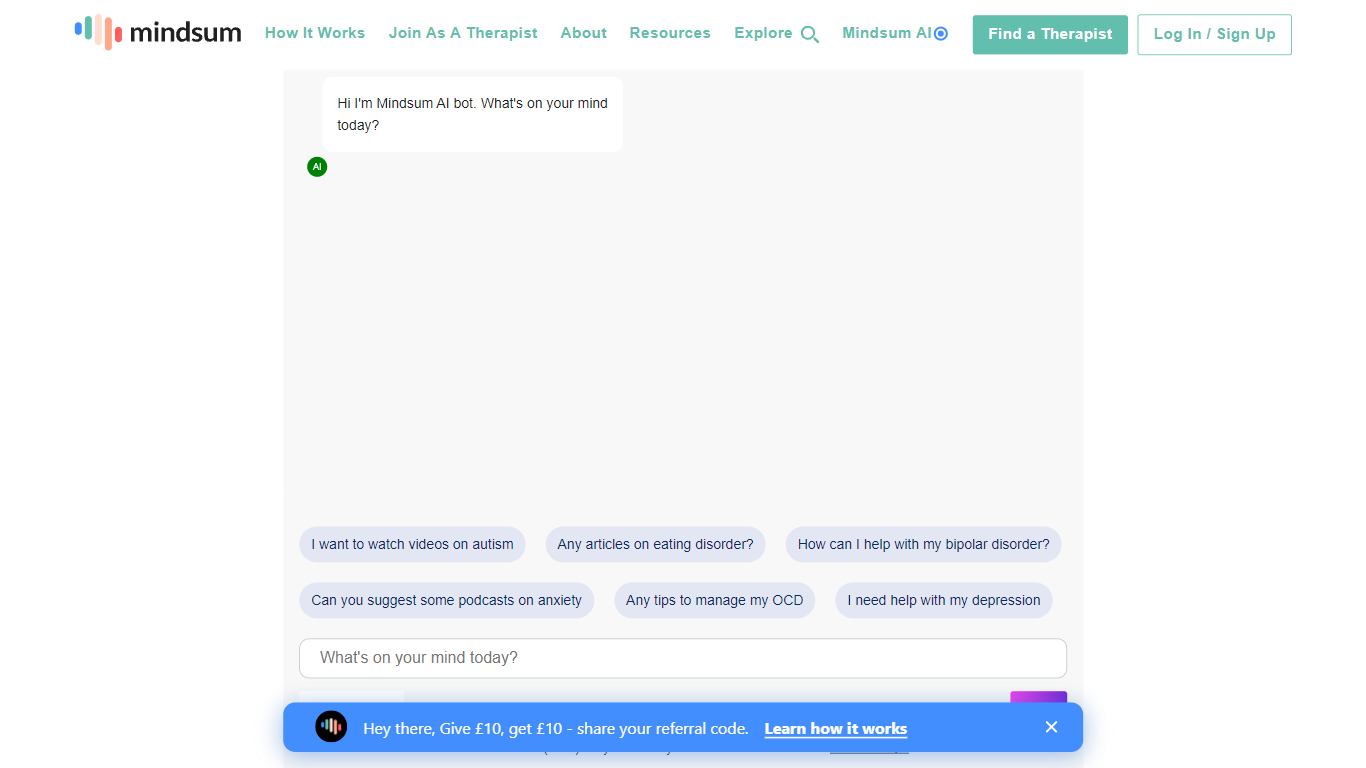 Mindsum AI is the innovative platform designed for individuals seeking mental health support online. Operating in beta mode, Mindsum AI serves as a virtual assistant, aiming to connect users with therapists and provide resources for various mental health issues. With a friendly AI bot ready to assist, users can easily navigate the simple and intuitive interface to find videos on autism, articles on eating disorders, podcasts on anxiety, tips for managing OCD, and support for depression. Meanwhile, therapists can join the platform to expand their reach and impact. Mindsum AI emphasizes that while the bot provides helpful suggestions, it may not always be 100% accurate, and encourages users to read the FAQs for more reliable information.