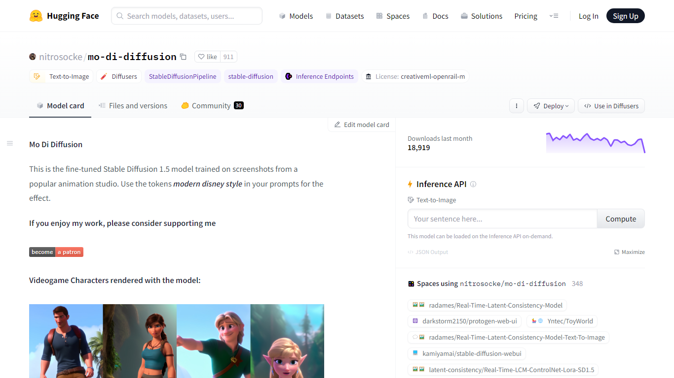 Discover the world of artificial intelligence and image generation with nitrosocke/mo-di-diffusion, an advanced model designed to bring your creative visions to life. Housed within the innovative ecosystem of Hugging Face, this fine-tuned Stable Diffusion 1.5 tool is your gateway to producing captivating visual content. Leveraging screenshots from a renowned animation studio, the model provides a distinctive ‘modern disney style’ that adds a magical twist to your generated images. Whether you’re creating videogame characters, animal motifs, or enchanting landscapes, mo-di-diffusion transforms simple text prompts into stunning pieces of art. Offering both a sophisticated API and user-friendly interfaces, Hugging Face ensures seamless access to this creative powerhouse. Dive into the simplicity of AI-driven image generation where your imagination meets open-source technology – the perfect solution for artists, developers, and content creators.