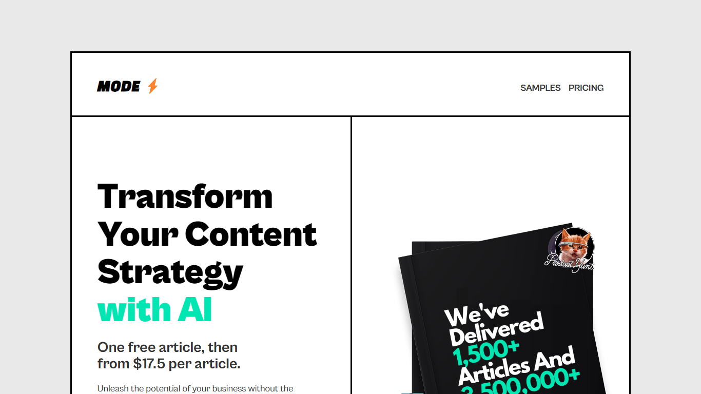 Transform your content strategy with MODE, your seamless solution for high-quality article writing at an unmatched price point. MODE synergizes the capabilities of human writers with artificial intelligence to revolutionize content creation, offering your first article free and subsequent pieces at only $17.5 each. Our service includes comprehensive keyword research, ensuring a minimum of 1,750 words per article, with SEO-optimized and fact-checked content. Additionally, enjoy the flexibility of optional branded article covers and AI-generated images, tailored to your preferences.