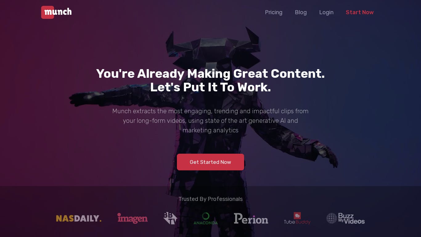 Munch uses state of the art AI to help you maximize ROI on your long-video content, by generating short, media-optimal clips for social media from your podcasts, interviews, webinars, broadcasts and more. Munch matches each clip with marketing and trend insights, ensuring the success and effectiveness of the content by determining the topic and “trendability” of each clip.