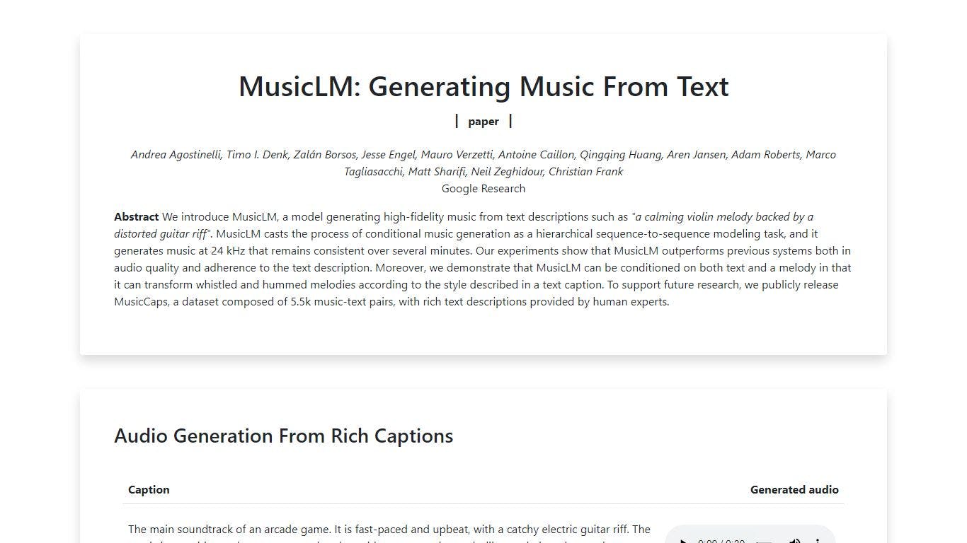 Google introduce MusicLM, a model generating high-fidelity music from text descriptions such as “a calming violin melody backed by a distorted guitar riff”.