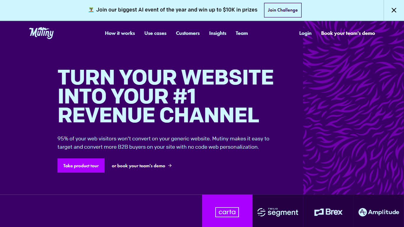 Elevate your B2B marketing strategy with Mutiny’s AI-driven web conversion platform. Discover how our innovative solution integrates seamlessly with your existing sales and marketing tools, allowing you to target your most promising opportunities through AI. Maximize the potential of your website by personalizing content for every visitor, creating dedicated landing pages for account-based marketing, and matching every landing page to your ad campaigns for scaled paid acquisition. Empower product-led growth with strategic CTA switches for different user segments. With our platform, you’re equipped to build, test, and optimize your site through intuitive A/B testing.
