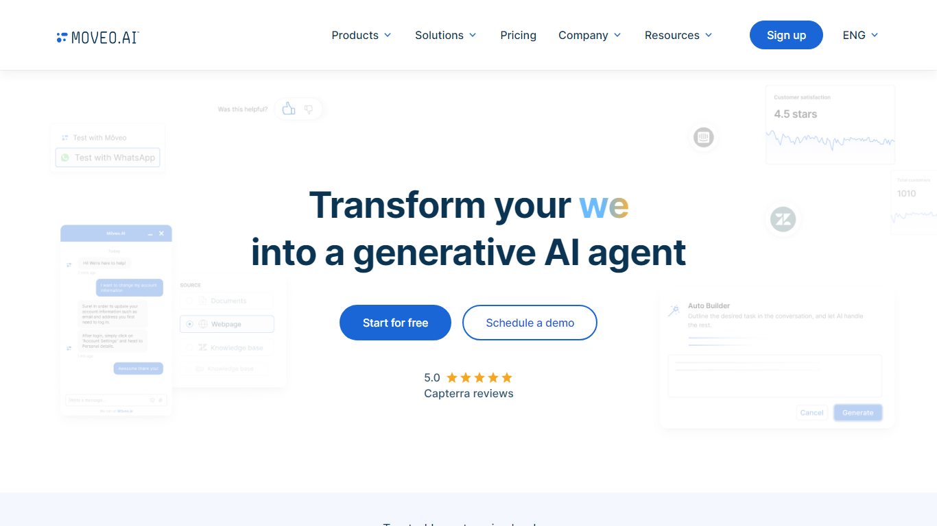 Elevate your customer experience to new heights with Mοveo.AI, the premier conversational AI agent designed to revolutionize client interactions. Our advanced chatbot technology streamlines communication by automating tasks, offering out-of-the-box integrations, and an open API for maximum flexibility. Discover the future of customer service with features like Generative AI, capable of optimizing operations by fully leveraging your available data. Our intuitive Auto Builder empowers you to craft an AI virtual agent specifically tailored to your processes, enabling you to offer support to customers worldwide more efficiently. Stay ahead of the industry trends with Moveo.AI, your ally in enhancing customer experience and operational efficiency with cutting-edge conversational AI.