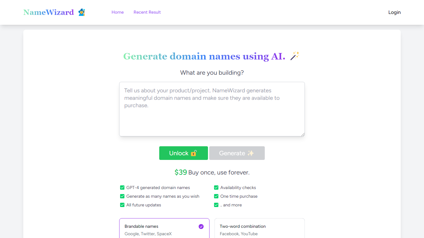Invest in your future with a one-time purchase of $39, and you’ll gain unlimited access to our domain name generation service, including all future updates. Our platform is ideal for entrepreneurs, startups, and creators looking for brandable names and two-word combinations inspired by giants like Google, Facebook, and SpaceX.