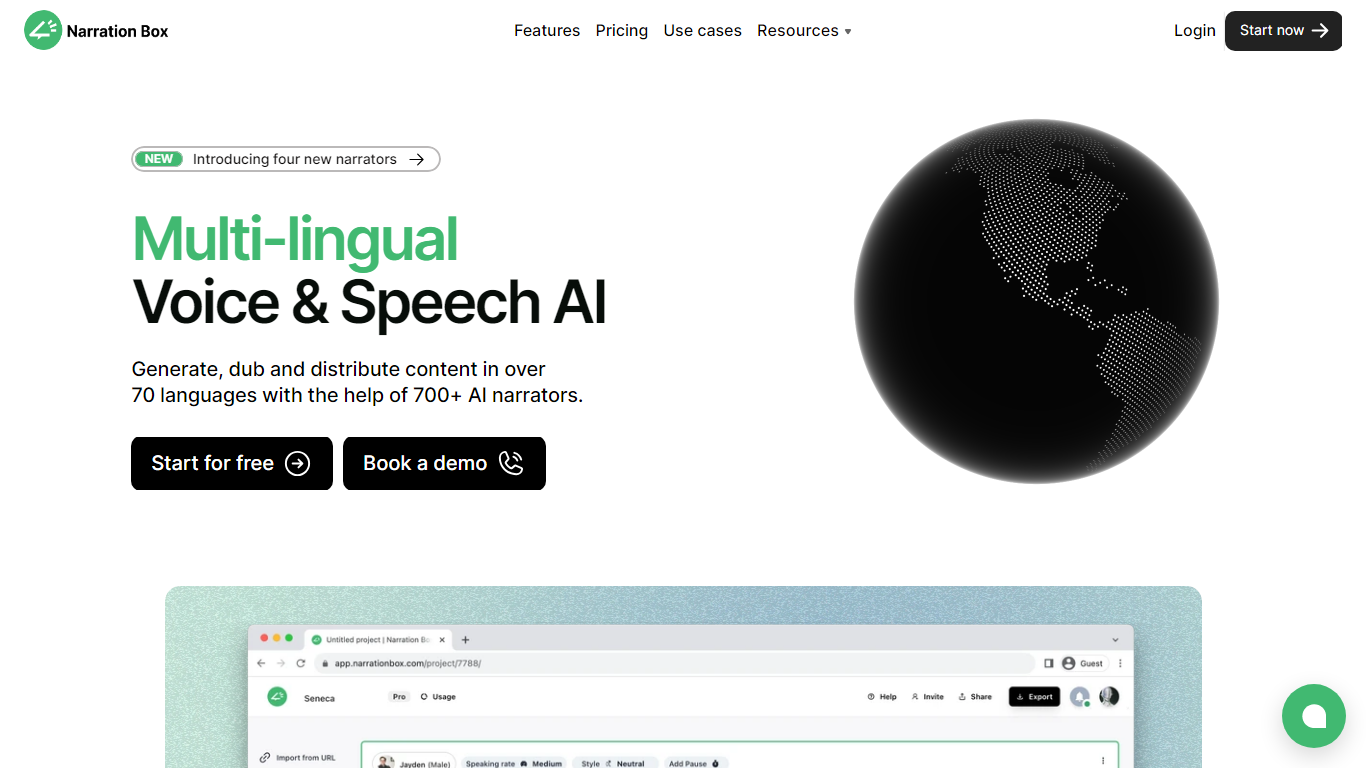 Narration Box is the ultimate multi-lingual Voice & Speech AI platform designed to revolutionize content generation and distribution. With four newly introduced AI narrators, the platform now boasts a comprehensive suite of over 700 top-notch AI narrators, ready to create ultra-realistic voiceovers in over 70 languages. Tailor-made for a global audience, Narration Box empowers users to break language barriers and engage listeners with customizable voices enriched with a wide range of emotions. Whether you’re creating podcasts, audiobooks, or educational materials, Narration Box provides high-quality exports without compromises. Enjoy a seamless user experience with quick turnaround times and a voice that matches your every need. Join businesses and creators worldwide who trust and love Narration Box for its exceptional voice synthesis capabilities.