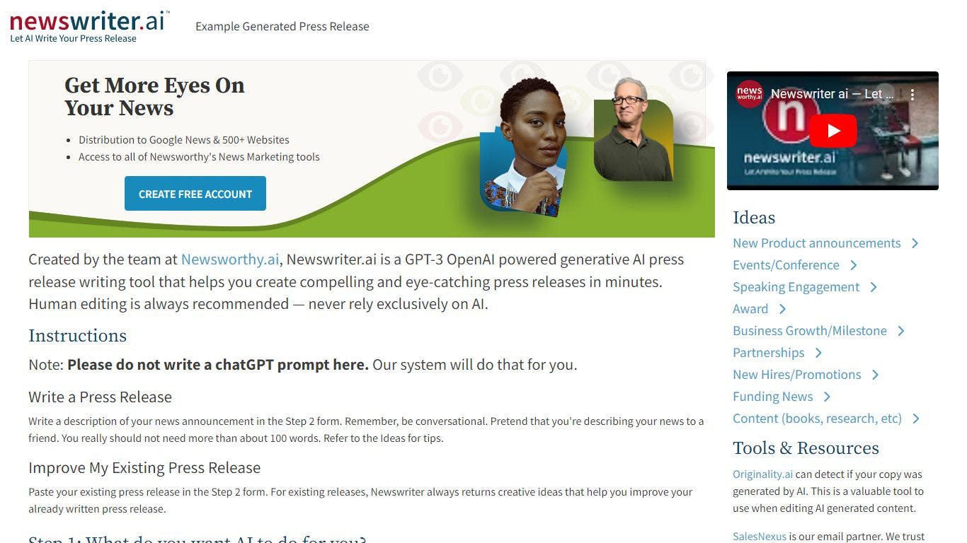 Newswriter.ai is a free AI-powered press release writing tool that helps you create compelling, eye-catching press releases in minutes. Using GPT-3 OpenAI technology, Newswriter provides two services: writing a new press release, or improving an existing press release.