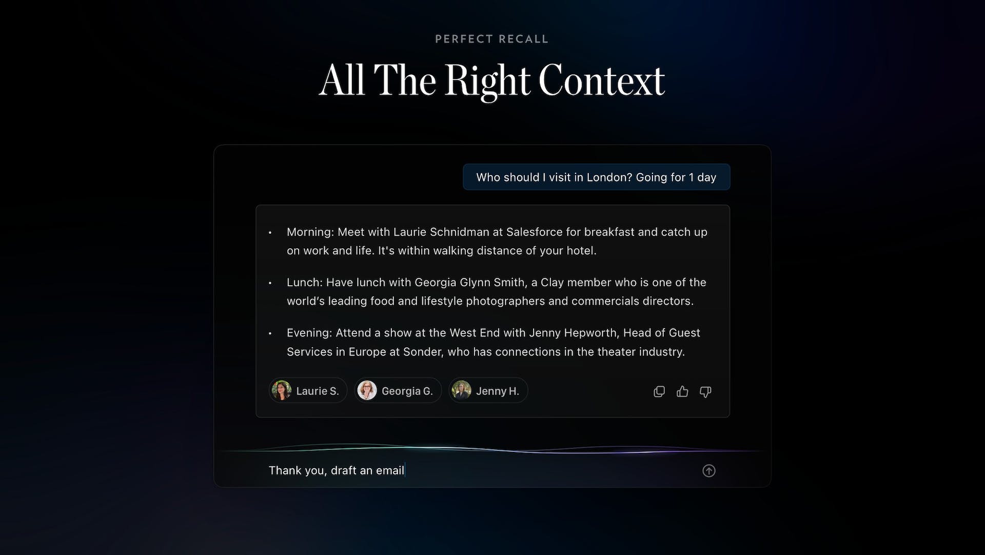 Nexus is the worldâs first AI navigator for your entire network, combining the latest in artificial intelligence with the full power of Clay. Nexus is a collaborative partner who has perfect recall for everyone you’ve ever met, with the full context of your relationships with them. Ask Nexus for help with reasons to get back in touch, ideas for the perfect outreach email, and even the perfect gift idea for that special touch.