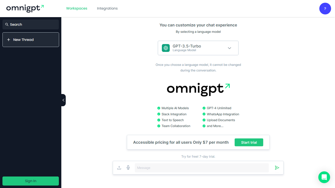 Unlock the full capabilities of GPT-4 with OmniGPT, your go-to solution for innovative AI interactions on the web and WhatsApp. For a flat fee of just $7 a month, you can explore the cutting-edge features of GPT-4 Plus Unlimited.