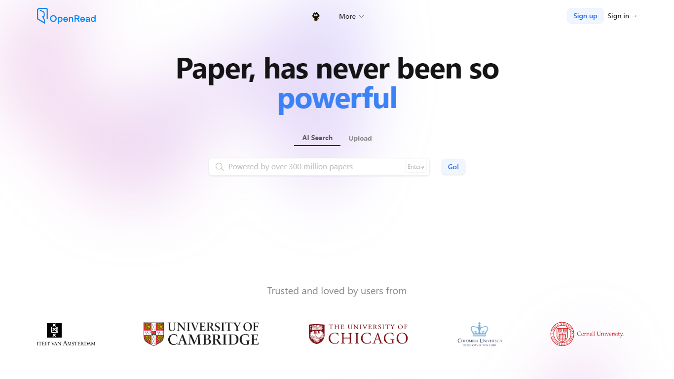 OpenRead is an advanced academic platform committed to enhancing the research experience by removing traditional barriers to knowledge access. Trusted by a dedicated user base, OpenRead utilizes AI-driven search capabilities to aid researchers and students alike in their quest for academic material.