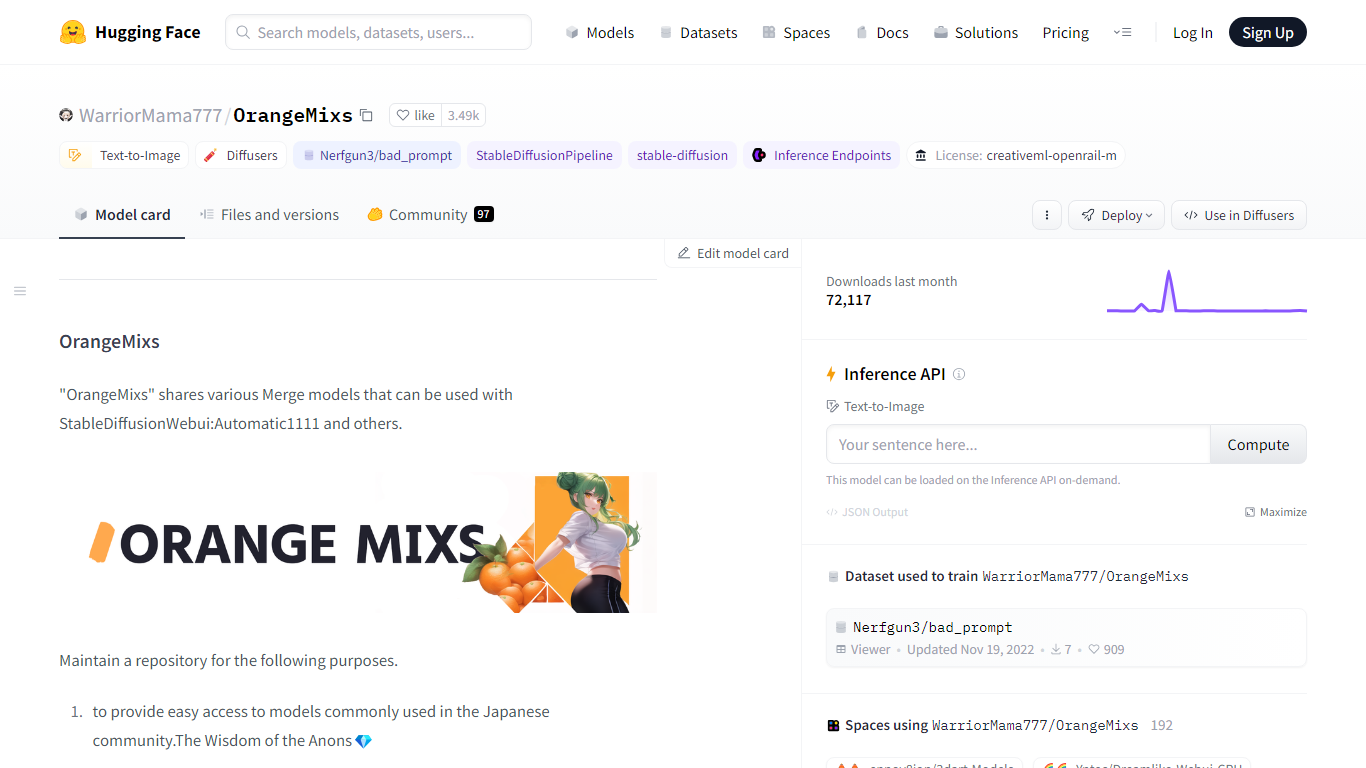 Embark on a creative expedition with WarriorMama777’s OrangeMixs, a treasure trove of Merge models designed for the avant-garde StableDiffusionWebui:Automatic1111 and other platforms. Curated for both the Japanese community and international creators, OrangeMixs serves as an accessible repository for both popular models and original creations by WarriorMama777, offering an array of tools for artistic and commercial endeavor. Discover models like the nuanced AbyssOrangeMix series and the vibrant ElyOrangeMix, each providing a unique illustration style and advanced features for a tailored generative art experience. With a commitment to democratizing AI, this Hugging Face space is a beacon for open-source AI advancements, where quality and community go hand-in-hand.