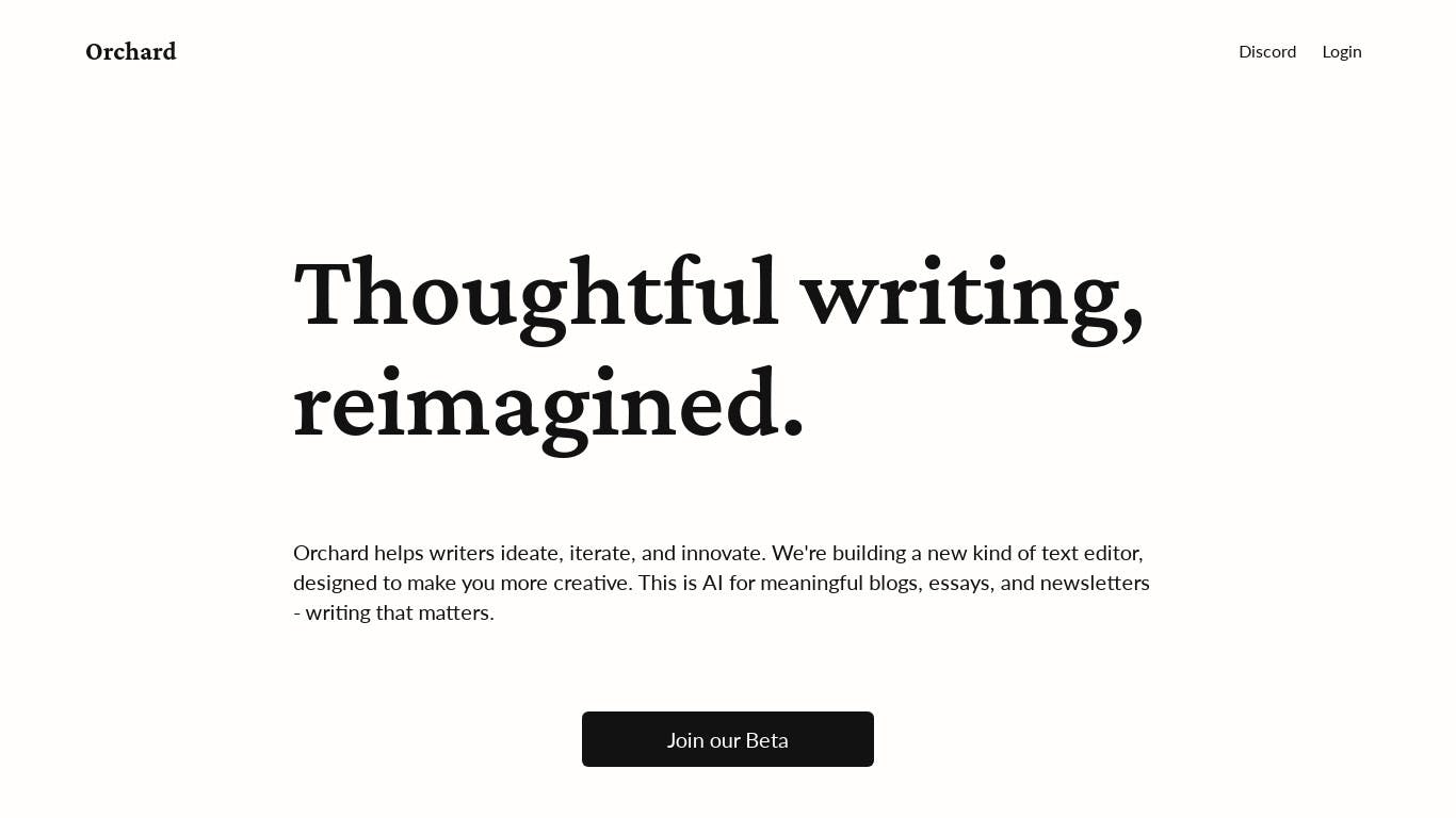 Thoughtful writing, reimagined. Orchard helps writers ideate, iterate, and innovate. We’re building a new kind of text editor, designed to make you more creative. This is AI for meaningful blogs, essays, and newsletters – writing that matters.