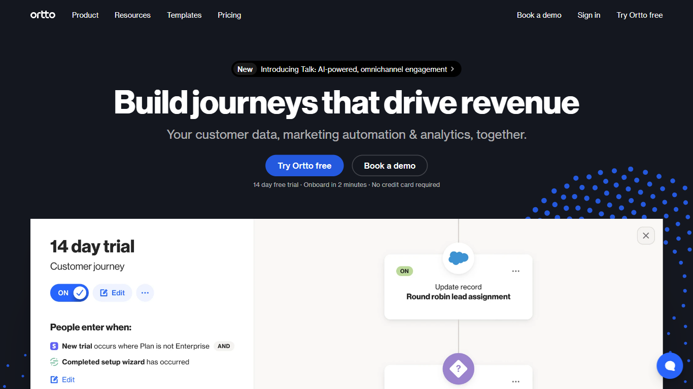 Ortto is a comprehensive platform that combines powerful marketing automation, AI-powered live chat and omnichannel engagement, and advanced analytics to help businesses unify and segment their customer data. With Ortto, you can create personalized customer journeys that drive revenue, using features such as email marketing, SMS marketing, push notifications, live chat, and more. The platform also offers a range of resources, including documentation, case studies, and the Ortto Academy, to help you get the most out of your marketing efforts. Try Ortto for free and book a demo to see how it can transform your marketing strategy.