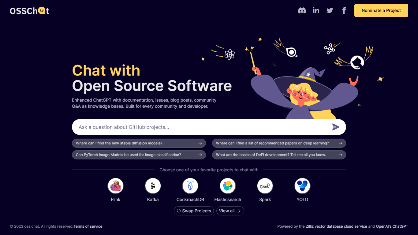 Discover a unique collaboration between open-source communities and enhanced AI with OSS Chat. This platform takes engagement to the next level by integrating documentation, issues, blog posts, and community Q&A into the knowledge base, making it a one-stop solution built for developers and every tech community. Whether you are looking for the latest stable diffusion models, want to dive into deep learning papers, or need assistance in image classification with PyTorch Image Models, OSS Chat provides you with tailored interactions. Delve into the world of DeFi development basics or swap projects to explore top names like Flink, Kafka, CockroachDB, Elasticsearch, Spark, and YOLO. Empowered by Zilliz vector database cloud service and OpenAI’s ChatGPT, this platform is engineered to enhance your development journey and community interaction in 2023.