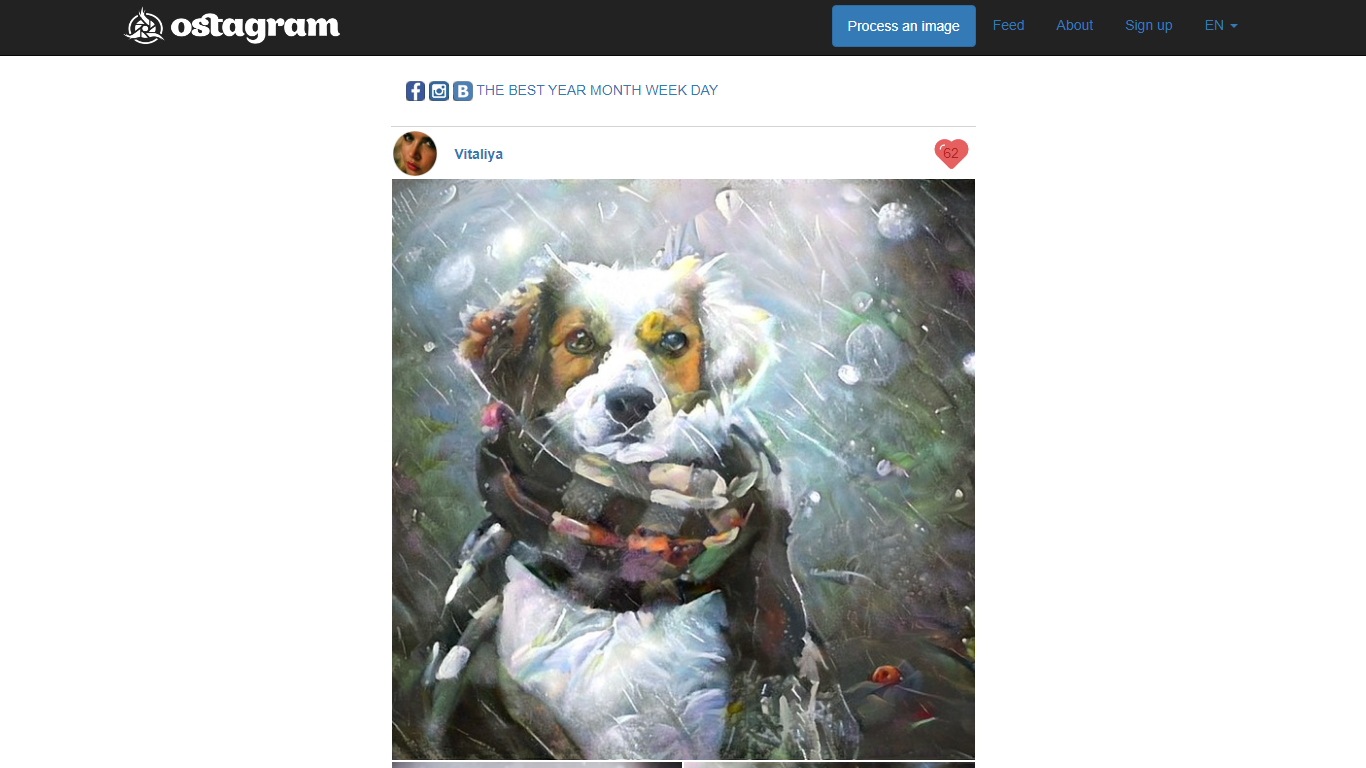 Discover Ostagram, an innovative online platform that offers a unique service: processing images with groundbreaking technology. A simple yet distinctive interface invites users to upload and personalize photos, explore a creative feed, and learn more about the service—all with the convenience of language options in English and Chinese. Ostagram captures the essence of creativity, allowing you to blend and transform images to create stunning visual art. Perfect for artists, designers, or anyone with a flair for innovative image manipulation, Ostagram stands as an enticing blend of simplicity and artistry.