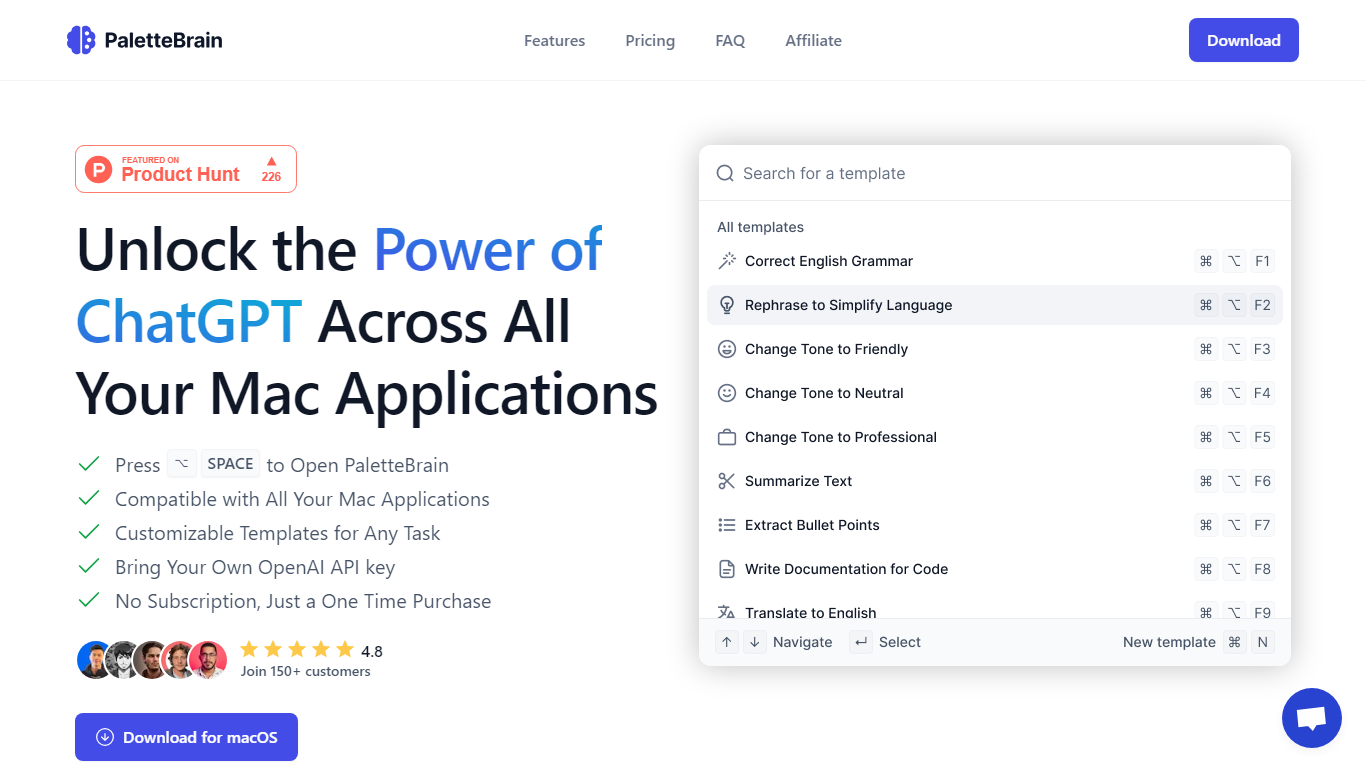 Enhance your Mac experience with PaletteBrain, the ultimate tool for boosting productivity. With PaletteBrain, effortlessly write better, code faster, and obtain answers swiftly with just a shortcut away. Compatible with macOS 10.12 and higher, PaletteBrain works seamlessly across all your favorite Mac applications. Customize your experience with tailored templates for any task, and retain full control by using your own OpenAI API key. Say goodbye to the tedious copy and paste routine; select text in any app, activate PaletteBrain, and directly inject responses using a shortcut. Designed for individuals and teams, our pricing plans are a one-time purchase with lifetime usage and updates. Regardless of whether you’re a solo user or part of an enterprise, PaletteBrain integrates with the apps you use daily, safeguarding your workflow without interruption.