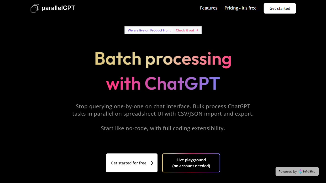 Discover the power of large-scale AI with our Batch or Bulk processing solution for ChatGPT AI! Our innovative platform enables you to process ChatGPT queries in bulk quickly and effectively using a spreadsheet UI, perfect for teams looking to accelerate their workflow. Say goodbye to one-by-one querying and embrace the efficiency of CSV or JSON imports, allowing you to handle complex tasks in parallel. Our service is designed with both no-code users and developers in mind; you can start with minimum technical expertise and extend functionality with low-code customizations as needed. Rest assured, all data, including your prompts and generated responses, are securely stored in your own Google Cloud project, ensuring that sensitive information remains private. Collaborate with ease using custom roles, and scale your ChatGPT interactions like never before—all for free.