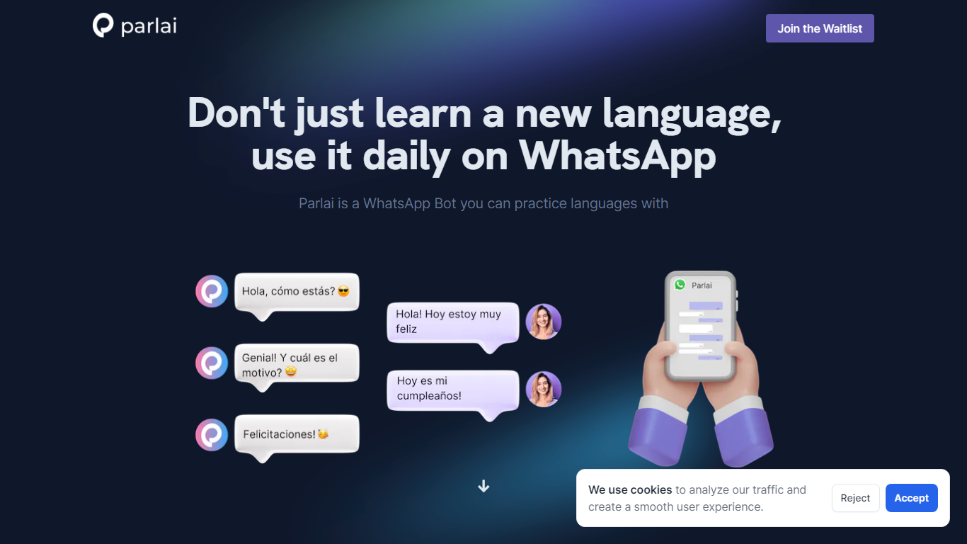 Parlai is revolutionizing the way people learn and use new languages through seamless integration with WhatsApp. With Parlai, language learning becomes an engaging, efficient, and fun daily activity. Designed to create realistic conversation experiences, Parlai allows users to engage in spontaneous messages and voice notes, mimicking human-like interactions that greatly enhance the learning process. As a personalized chatbot, Parlai tailors conversations to individual interests, provides immediate feedback on mistakes, encourages vocabulary expansion, and even brings laughter into the mix with memes and cultural recommendations. Master a new language by chatting casually and effortlessly with Parlai’s innovative features.