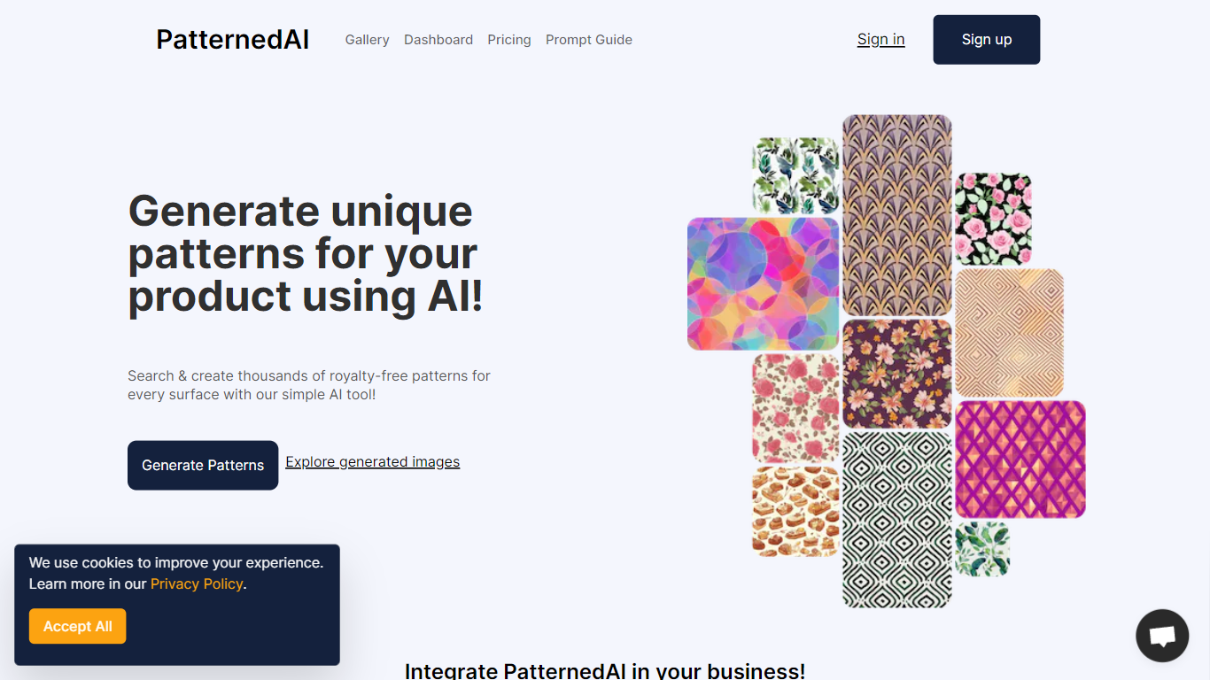 PatternedAI is an AI-powered tool that allows you to generate unique patterns for your product. With our simple AI tool, you can search and create thousands of royalty-free patterns for any surface. Whether you need patterns for textiles, wallpapers, or any other application, PatternedAI has you covered. Our tool enables you to generate seamless patterns in seconds without any visible seams, making it perfect for professional use. You can also turn text into unique patterns, create variations of existing patterns or images, and download high-resolution patterns for your prints. PatternedAI is the perfect solution for businesses looking to enhance their product designs with creative and customizable patterns.