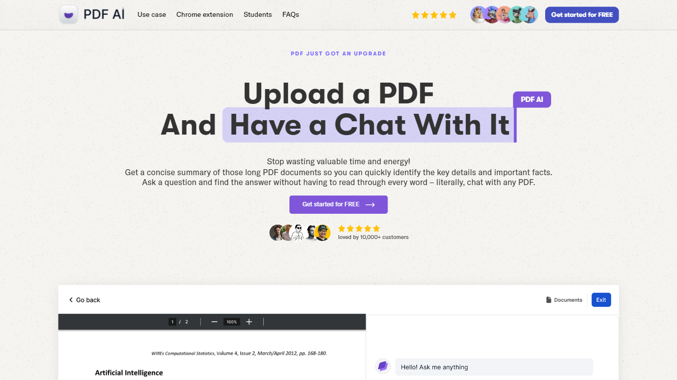 Revolutionize your document handling with PDF AI, the cutting-edge software designed to enhance productivity and simplify your workflow. With PDF AI, you unlock the potential of interacting with any PDF document through an intuitive chat interface. Upload documents up to 50MB and effortlessly engage with the content, receiving instant answers and summaries to your questions. Say goodbye to the tedium of sifting through lengthy documents, as PDF AI is engineered to identify key details and important facts with unparalleled ease. Loved by over 10,000 customers, this powerful AI PDF reader is your gateway to decoding complex terms, extracting crucial information, and facilitating rigorous research with ease.