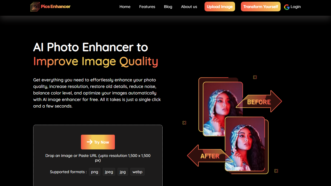 This advanced **AI Photo Enhancer** effortlessly amplifies your image quality, raises resolution, revives old memories by restoring details, diminishes noise, and balances color levels. **Optimize your photos** with a simple, single-click process that provides instant results. Supporting a range of formats including png, jpeg, jpg, and webp, the tool accommodates a maximum resolution of 1,500 x 1,500 px, making it ideal for various use cases. Whether you’re looking to touch up personal snapshots or improve professional imagery, this tool is the perfect companion for achieving superior visuals.