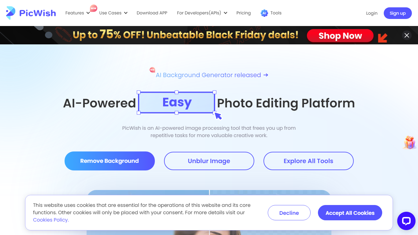 Revolutionize your photo editing experience with PicWish, your go-to AI-powered Photo Editing Platform. Discover a seamless editing workflow as PicWish takes on the tedious and repetitive tasks, leaving you with more time for creativity and innovation in your projects. Whether you need to remove backgrounds with precision, unblur images to crystal clear quality, or explore an array of advanced editing tools, PicWish has got you covered. Tailored to both professional designers and hobbyists, this platform offers easy-to-use features packaged in a user-friendly interface. Embrace the power of artificial intelligence and elevate your images effortlessly with PicWish — where your editing is only limited by your imagination.