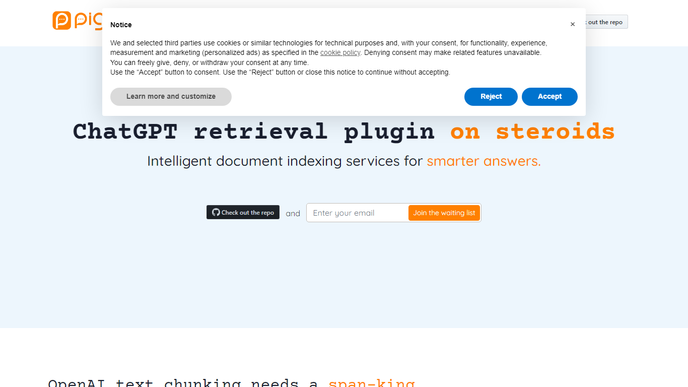 Maximize the accuracy of your ChatGPT responses with Pigro’s state-of-the-art retrieval plugin. Our intelligent document indexing services go beyond the basics, offering you smarter answers that understand the complexity of your documents. Discover Pigro’s advanced AI-based text chunking, which respects the structure and semantics of your content for more relevant spans of text. Benefit from our generative indexing that ensures only the most pertinent information in response to your query. With support for multiple document types and languages, Pigro is designed to enhance the precision and utility of information retrieval. Anticipate the future with our upcoming search result filtering feature, ensuring access permissions are adhered to. Join our waiting list today to transform the way you access knowledge with Pigro’s API for a smarter, more efficient search experience.