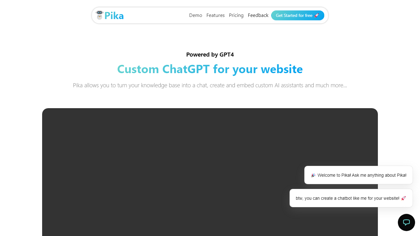 Experience seamless integration with Pika, your personalized ChatGPT for your website. Optimized for GPT-4, Pika enables you to transform your knowledge base into a conversational AI chatbot within minutes. Enhance user engagement by creating and embedding custom AI assistants tailored to your brand’s voice and your customers’ needs. With Pika, the power of natural language processing is at your fingertips, offering instant answers from your uploaded documents and ensuring a smarter, more intuitive user experience. Trusted by industry professionals, Pika promises a revolutionary approach to online interactions, highlighted by adaptive learning capabilities, instant deployment, and valuable analytics. Start for free today and watch Pika revolutionize the way you interact with your audience.