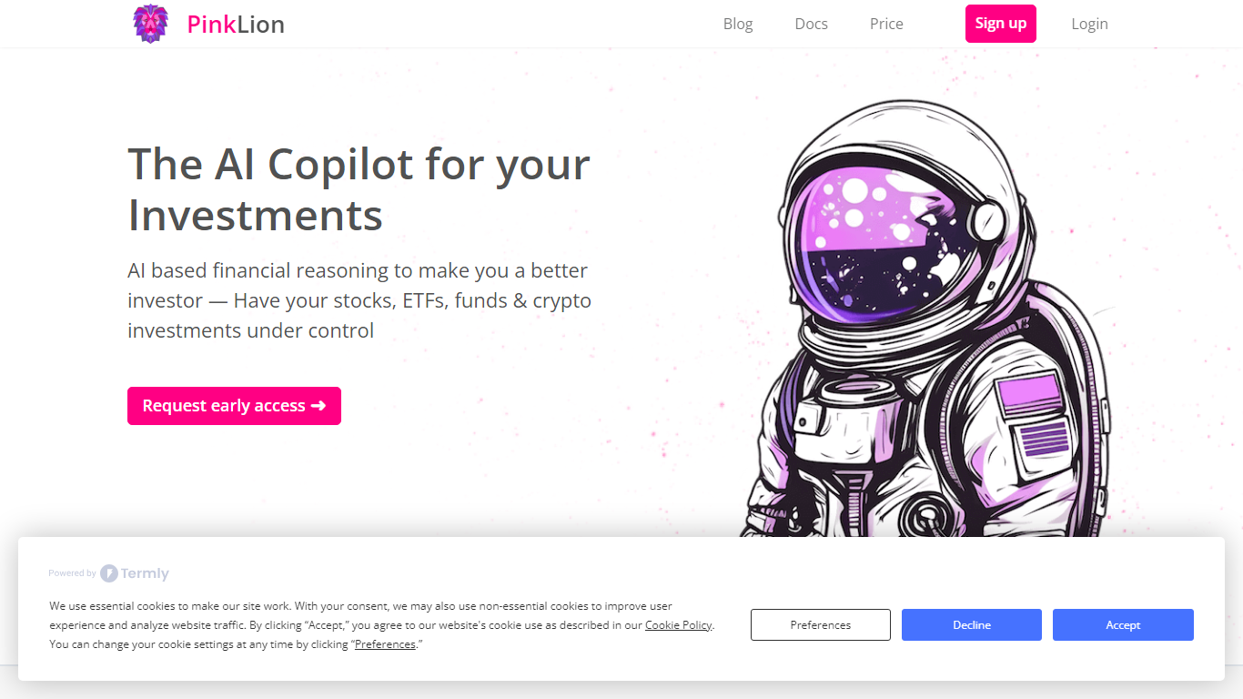 Revolutionize your investment strategy with PinkLion, the AI-powered financial assistant designed to enhance your investment acumen. Whether you are a beginner or an experienced investor, PinkLion’s advanced analytics and forecasting capabilities empower you with control over your stocks, ETFs, funds, and cryptocurrency holdings. Dive into scenario simulations to test your investment hypotheses, explore asset forecasts that compile insights from analysts and PinkLion’s algorithms, and leverage portfolio analytics for in-depth insights into your investments. Request early access to embark on a journey of informed decision-making and strategic investing with PinkLion.