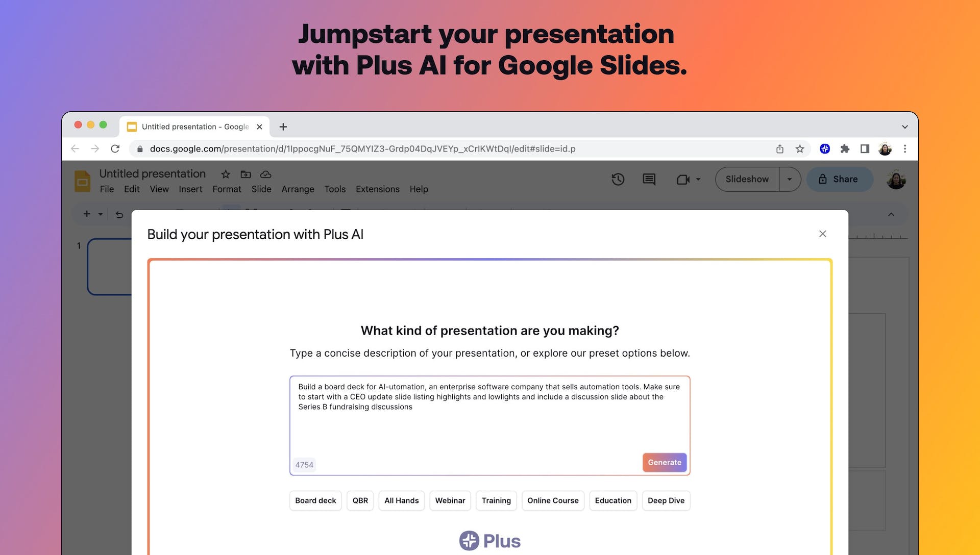 Build presentations in minutes with Plus AI. Starting with a blank deck is one of the most challenging parts of building a presentation. Plus AI helps you create an outline, build a first draft, and suggest additional edits to your slides.