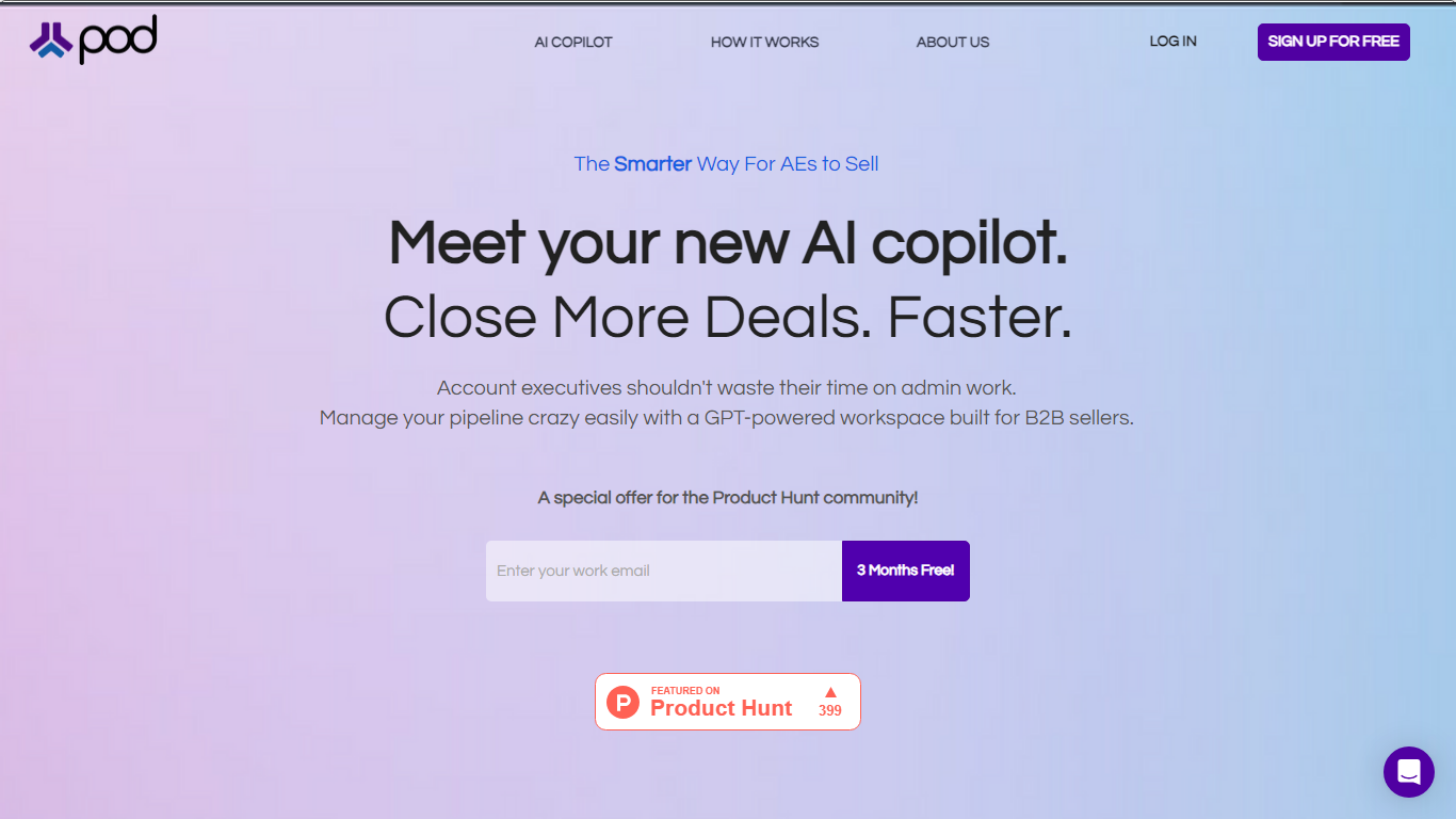 Maximize your sales potential with Pod, the essential AI workspace designed specifically for B2B sellers. Pod seamlessly integrates generative AI and automation within your daily sales processes, empowering you to streamline your pipeline management and accelerate deal closures. With Pod, you can reduce the time spent on administrative tasks and focus more on strategic selling, making your journey to President’s Club smoother and more achievable. Take advantage of features like summarized knowledge, personalized emails, and automated data entry to enhance your productivity. Embrace the smarter way to sell with a GPT-powered workspace that understands the needs of account executives, sales leaders, and revenue operations professionals. Sign up today and get started with a special 3-month free offer exclusively for the Product Hunt community!