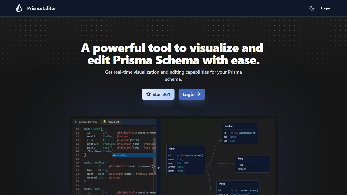 Prisma Editor is an innovative web-based tool that serves as a Prisma Schema Editor, offering visualization and editing capabilities to streamline the database schema management process. It allows users to interact with their database structures in real-time, facilitating immediate feedback and adjustments to their Prisma schema.
