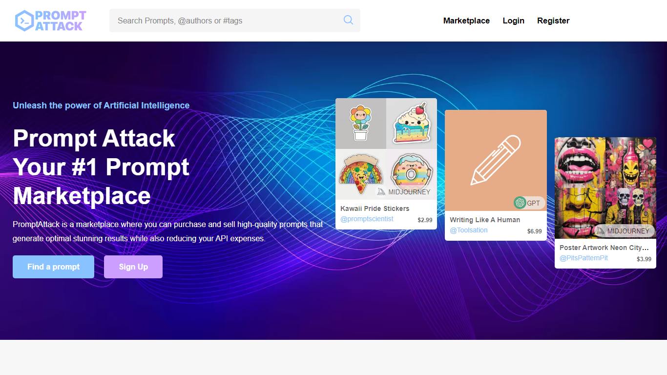Welcome to **Prompt Attack**, the premier prompt marketplace dedicated to harnessing the power of Artificial Intelligence for creating exceptional results. At Prompt Attack, we offer a specialized platform where users can both purchase and sell high-quality prompts tailored to deliver stunning outcomes while simultaneously cutting down on API costs. Our user-friendly interface makes it effortless to find the perfect prompt to suit your needs, and with easy-to-navigate options like Sign Up, Login, and Register, you can quickly become a part of our growing community. For those looking to infuse creativity into their AI algorithms, our marketplace showcases a diverse collection of prompts, ranging from **MIDJOURNEY Kawaii Pride Stickers** to **GPT Writing Like A Human** compositions, and beyond. Prices are transparent and accessible, starting as low as $1.99, making it both affordable and convenient to find the exact prompt you need. Join Prompt Attack now and unlock the full potential of AI in your projects!