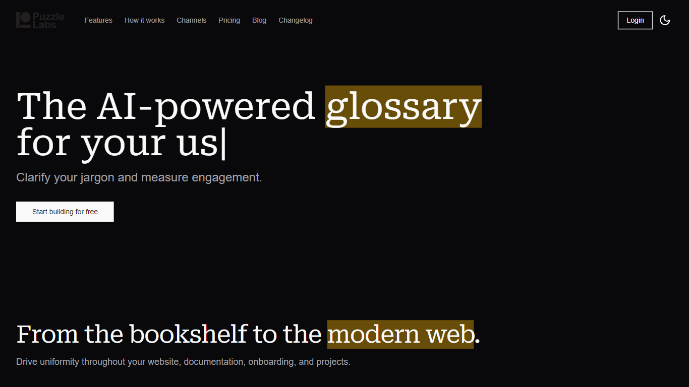 Puzzle Labs is an AI-powered glossary tool that helps teams clarify their industry jargon and enhance communication. With its dynamic and automated features, Puzzle Labs allows users to easily link text, websites, documents, images, and videos, providing valuable context and background information. Unlike conventional static glossaries, Puzzle Labs is data-driven, offering insights and analytics to measure engagement and improve communication across various channels. Whether it’s on your website, documentation, onboarding, or projects, Puzzle Labs drives uniformity and helps users build a glossary effortlessly. Start building your glossary for free with Puzzle Labs.