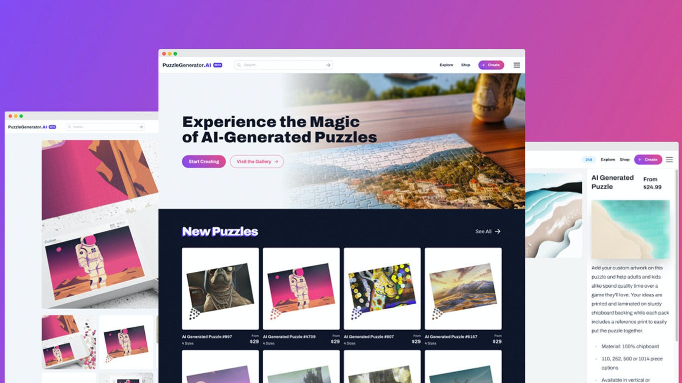 PuzzleGenerator.ai is an innovative tool that lets you create captivating, custom jigsaw puzzles using simple text prompts. Its cutting-edge AI algorithm generates unique and visually stunning puzzles, transforming your ideas into interactive masterpieces. From educational tools to personal gifts, PuzzleGenerator.ai is perfect for any occasion. Ignite your creativity and start designing today!