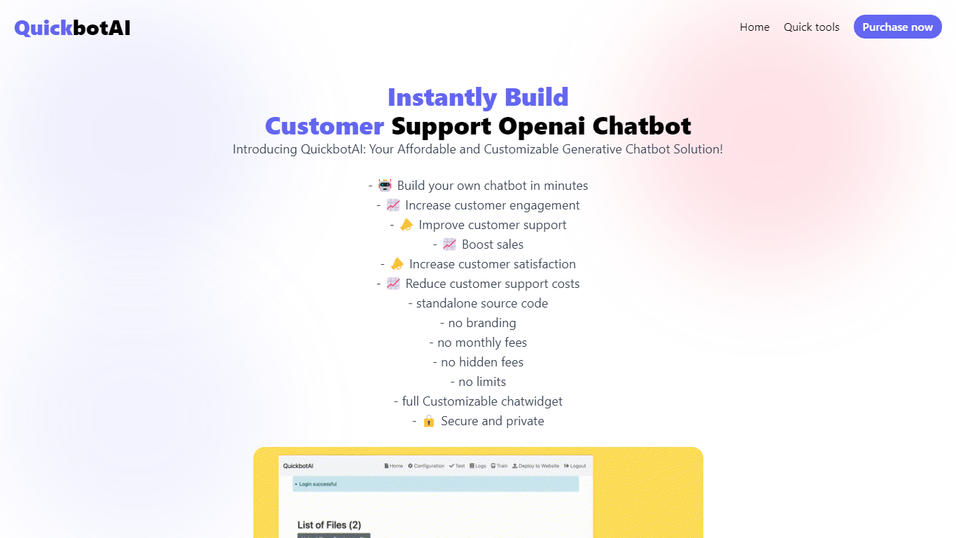 What sets QuickbotAI apart is our commitment to providing a cost-effective solution. You get standalone source code with no ties; it’s fully customizable to fit your brand, no monthly or hidden fees, and absolutely no limits on usage. Plus, you can trust us to keep your interactions secure and private.
