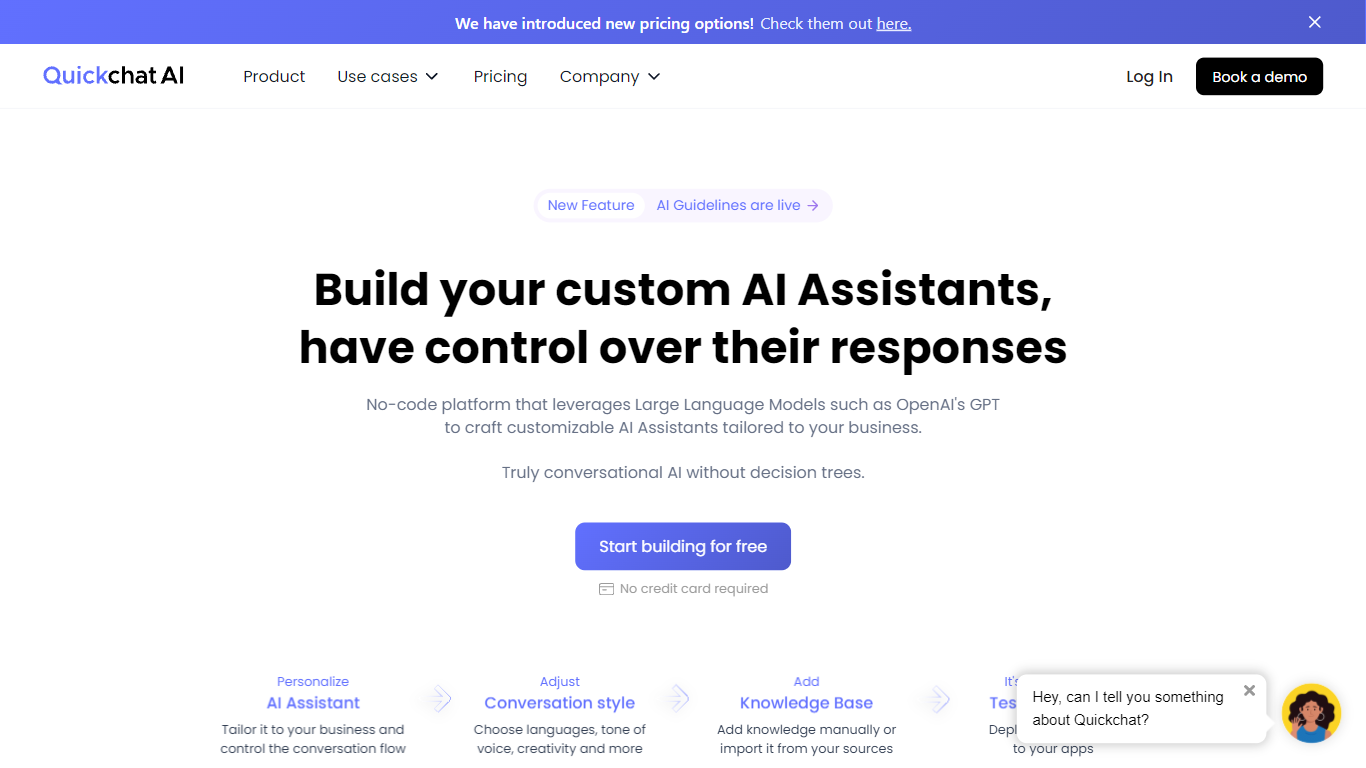 Quickchat AI is a revolutionary platform that offers AI-powered chatbots and virtual assistants to elevate customer support, streamline sales processes, and improve internal knowledge management. With Quickchat AI, businesses can easily build custom AI assistants and personalize their conversation flow, tone, and language. The platform also allows users to add their own knowledge base and integrate with their favorite apps and tools. Trusted by hundreds of large and small companies, Quickchat AI provides relevant and non-generic answers, keeps brand voice consistent, and handles millions of messages with ease. Join the AI revolution today and start building for free.