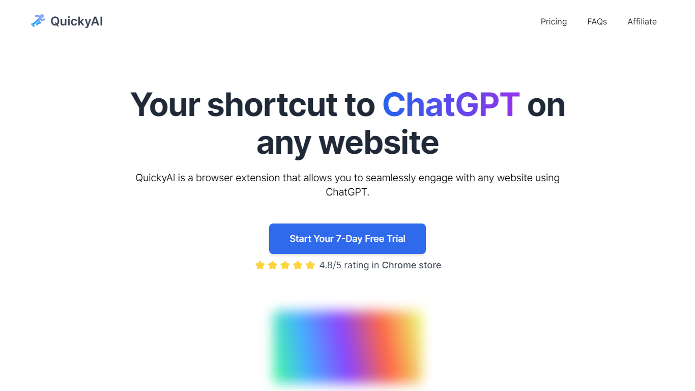 Embrace the future of seamless AI integration with QuickyAI – the ultimate browser extension that catapults your productivity straight into the stratosphere. QuickyAI is your one-click portal to utilizing ChatGPT across every website you navigate, directly in your browser. Offering an impressive 4.8/5 Chrome Store rating and compatibility with all popular browsers, QuickyAI is revolutionizing the way we interact with web content.