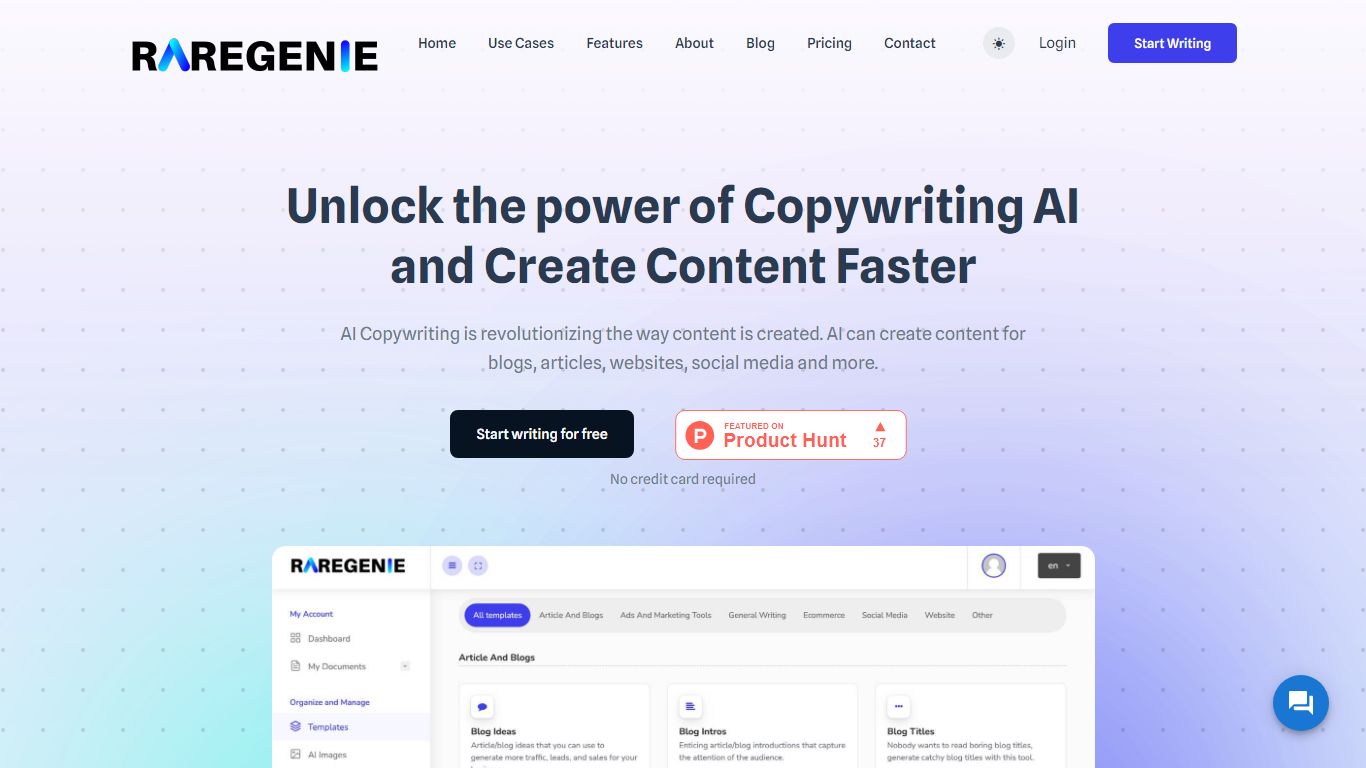 Experience the future of content creation with Raregenie, your AI-powered copywriting companion designed to streamline content generation across various platforms. Leveraging the power of artificial intelligence, Raregenie helps you create content for blogs, articles, websites, and social media with unprecedented speed and efficiency.