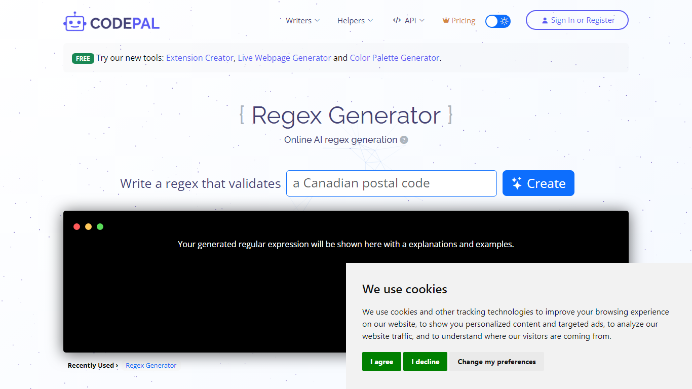 Unlock the full potential of your coding projects with our cutting-edge Regex Generator. Built for developers and tech enthusiasts alike, this platform offers a range of powerful writing and helper tools tailor-made to streamline your workflow. Our suite of Writers encompasses solutions for CI/CD management, Kubernetes orchestration, and code enhancement, ensuring your code is not only efficient but also bug-free and up-to-date. Dive into the Helpers section, a treasure trove designed to refine and optimize your coding process with tools such as Bug Detectors, Code Explainers, and Security Code Scanners. Harness the power of APIs with our comprehensive Learning Center, detailed API Reference, and user-friendly Getting Started guide. Whether you’re a seasoned pro or a budding coder, our platform offers a robust set of tools to increase productivity and bring your software development to the next level. Experience seamless integration and enhanced performance by signing in or registering today.
