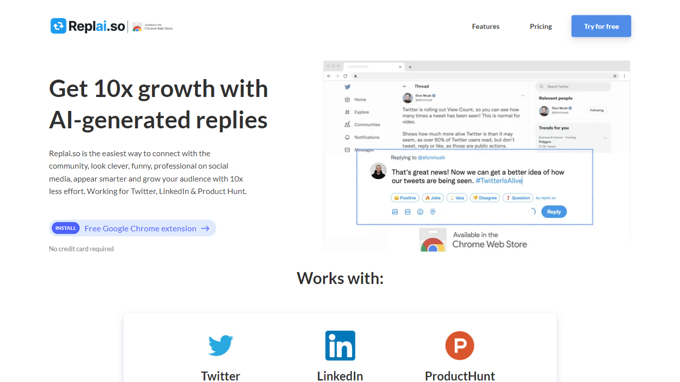 - **No Credit Card Required:** Users can try Replai.so for free without the need for a credit card.