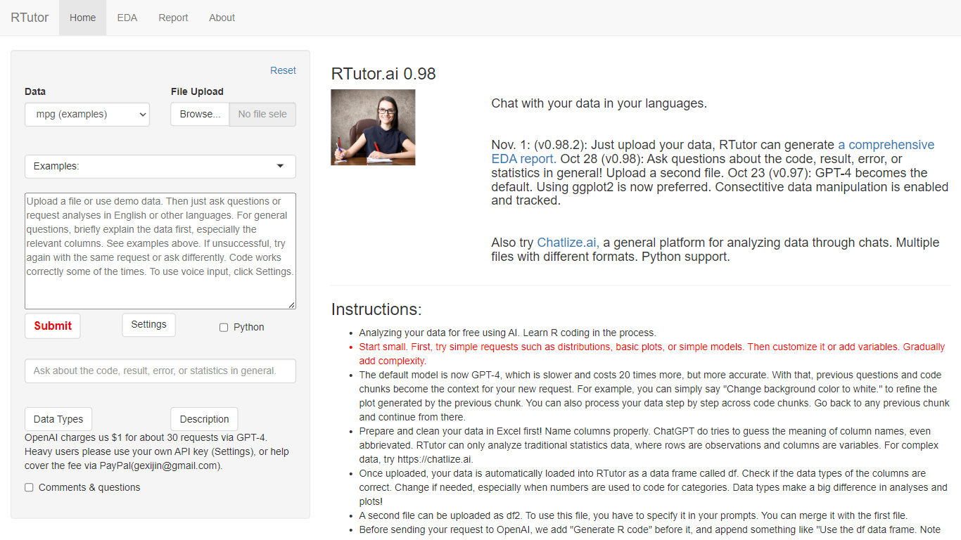 RTutor 0.98RTutor is a comprehensive and advanced AI tool that caters to the needs of students, educators, and professionals in the field of programming and data science. This tool offers a unique learning experience by providing interactive tutorials and coding exercises that cover a wide range of topics including R programming, data manipulation, statistical analysis, and machine learning.