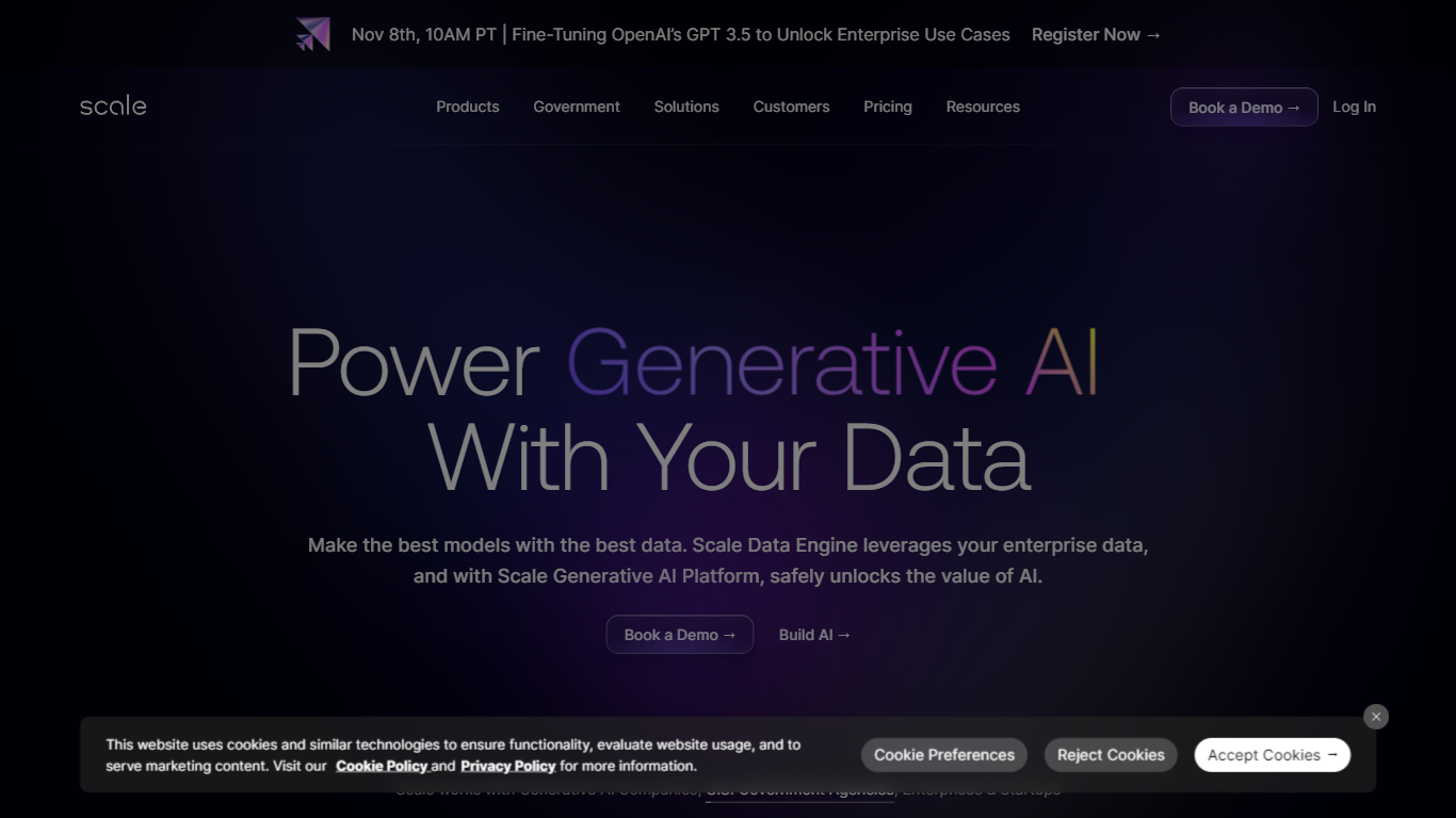 Accelerate the Development of AI Applications with Scale, a trusted provider of high-quality training data. Used by world-class companies, Scale offers data solutions for various AI applications, including self-driving cars, mapping, augmented reality/virtual reality (AR/VR), robotics, and more.
