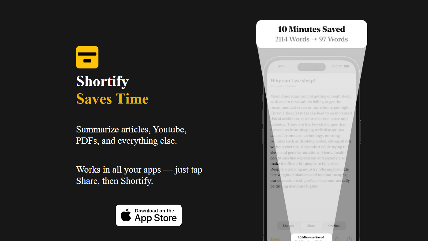 Shortify is a cutting-edge tool designed to help save time by summarizing content across various formats and platforms. Whether it’s an article, a YouTube video, or a PDF, Shortify condenses the information into concise summaries. Compatible with smartphones and tablets, it integrates seamlessly into your daily workflow through a simple tap on the ‘Share’ and ‘Shortify’ buttons within your favorite apps. The tool is especially useful for processing long videos, decluttering browser tabs, skimming through extensive blog posts, or previewing content before diving into a full read.