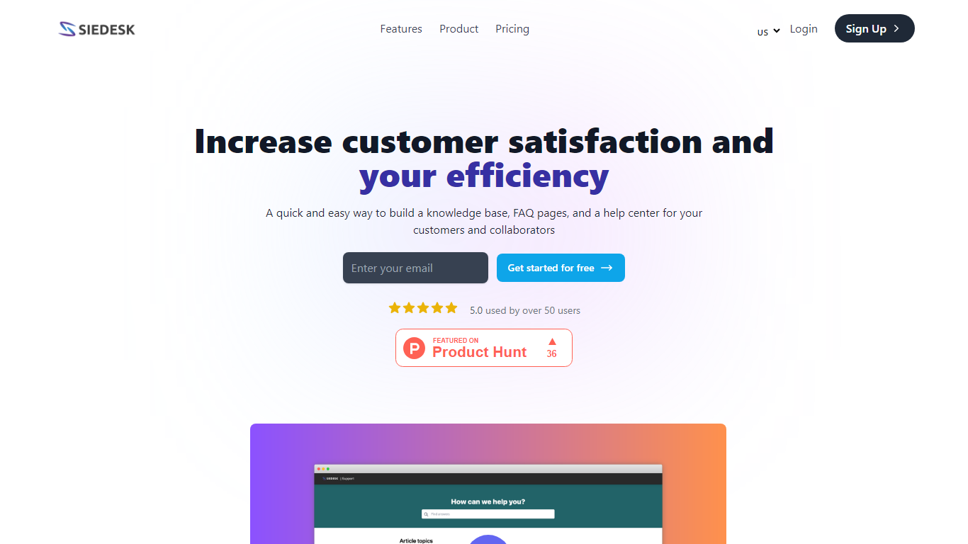 Optimize your knowledge management with Siedesk, the AI-assisted tool for creating comprehensive internal and external knowledge bases and FAQ pages. Enhance your business efficiency and save valuable time. Experience our solution today and see how a unified help center can transform customer satisfaction. Siedesk offers an effortless and fast way to build knowledge bases, FAQ pages, and a support center for both clients and employees. Start for free and join over 50 users who rate us 5.0 for our services.