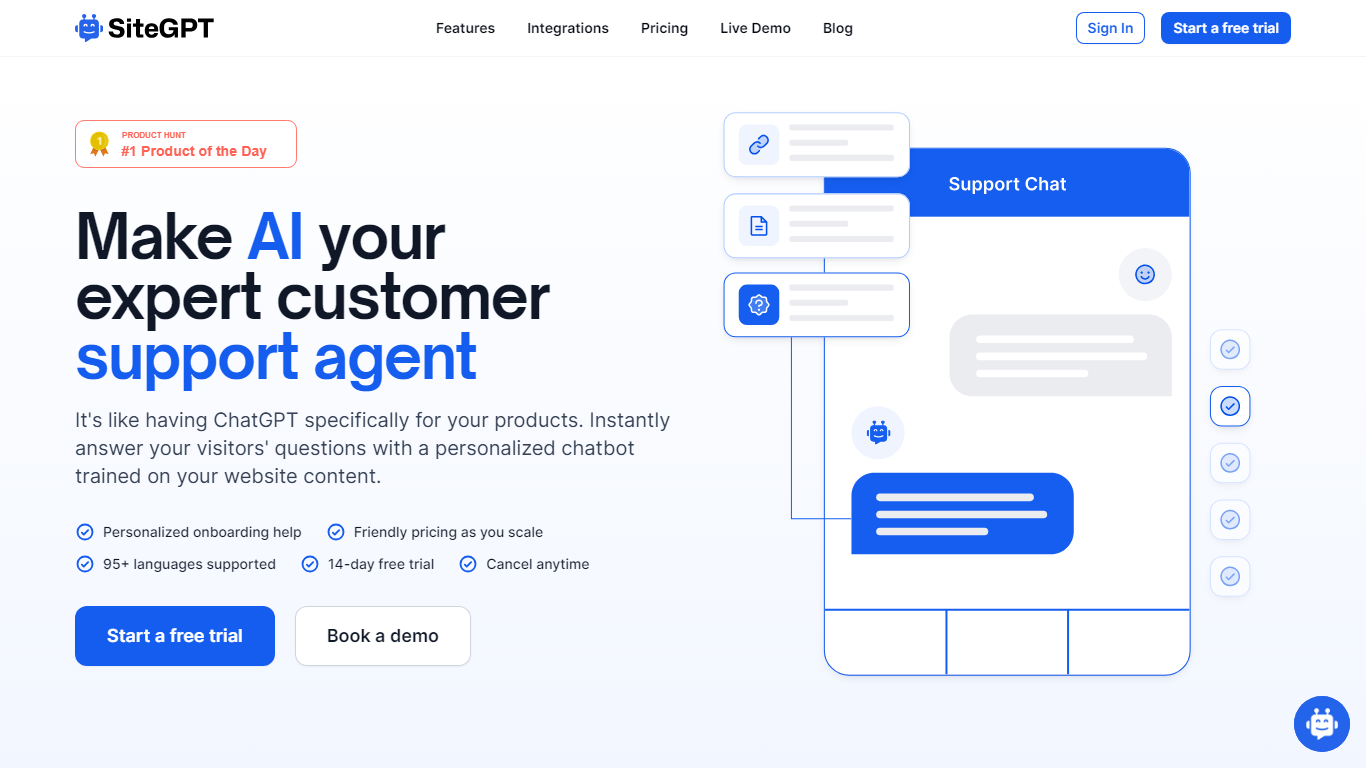 Unlock seamless customer support and elevate your digital presence with SiteGPT – a cutting-edge AI chatbot solution. Tailored to mirror your brand’s voice through personalized training on your website content, SiteGPT ensures that your visitors receive expert assistance at any time. With support for over 95 languages and robust integrations to enrich your toolkit, SiteGPT is designed to enhance customer experience and improve team productivity.