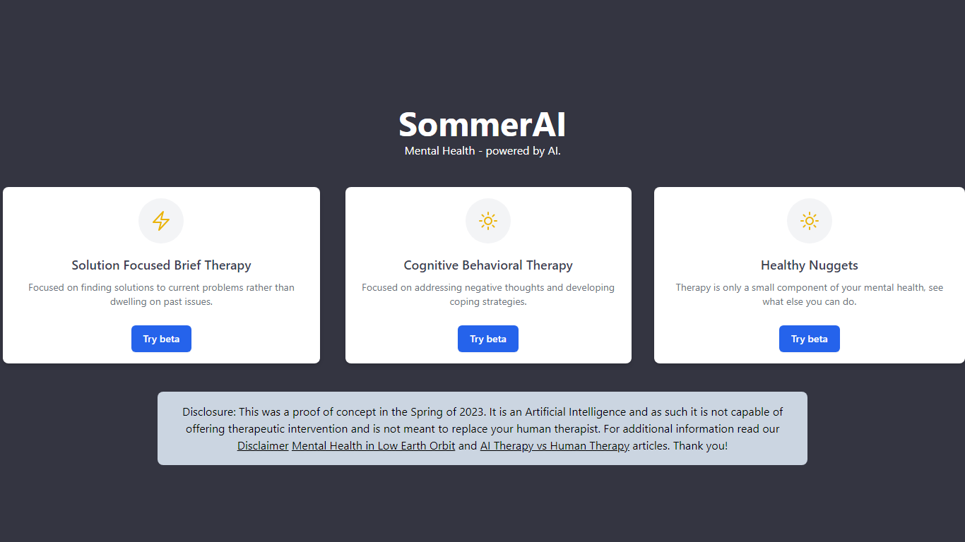 Despite our innovative use of AI in mental health, we assert that SommerAI is not designed to replace human therapists. We serve as a supplementary tool to support your mental health journey. For further clarity and understanding of our AI’s capabilities, we invite you to read through our detailed articles on ‘Mental Health in Low Earth Orbit’ and ‘AI Therapy vs Human Therapy’.