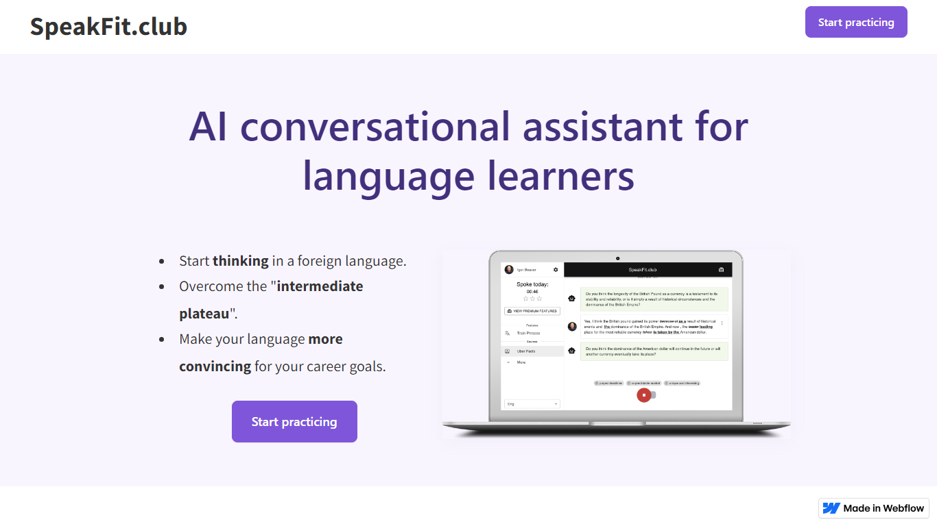 SpeakFit.club is an innovative language learning platform designed to help you think in a foreign language, overcome the common ‘intermediate plateau’, and enhance your language skills to align with your career aspirations. This AI conversational assistant offers a responsive, Webflow-powered experience for language learners looking to take their skills to the next level. With SpeakFit.club, you can start practicing immediately and see a marked improvement in your language proficiency.