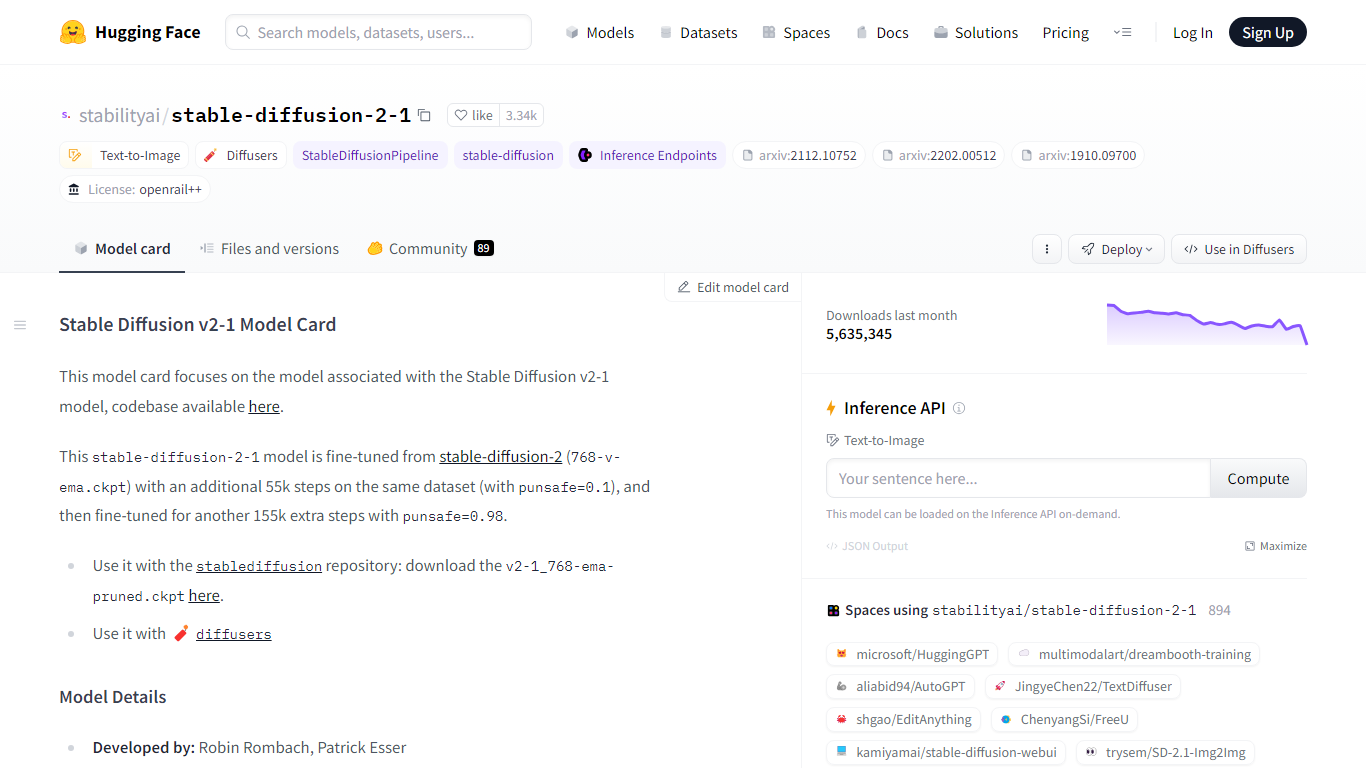 Delve into the intricacies of Stable Diffusion v2-1, crafted by a team of experts including Robin Rombach and Patrick Esser. Leveraging a Latent Diffusion Model equipped with a pretrained text encoder, this AI marvel enables you to explore the realms of artistic creation, safe content deployment, and the understanding of AI biases and limitations. Ready to engage with the transformative power of AI? Connect with StabilityAI’s Stable Diffusion v2-1 model today.