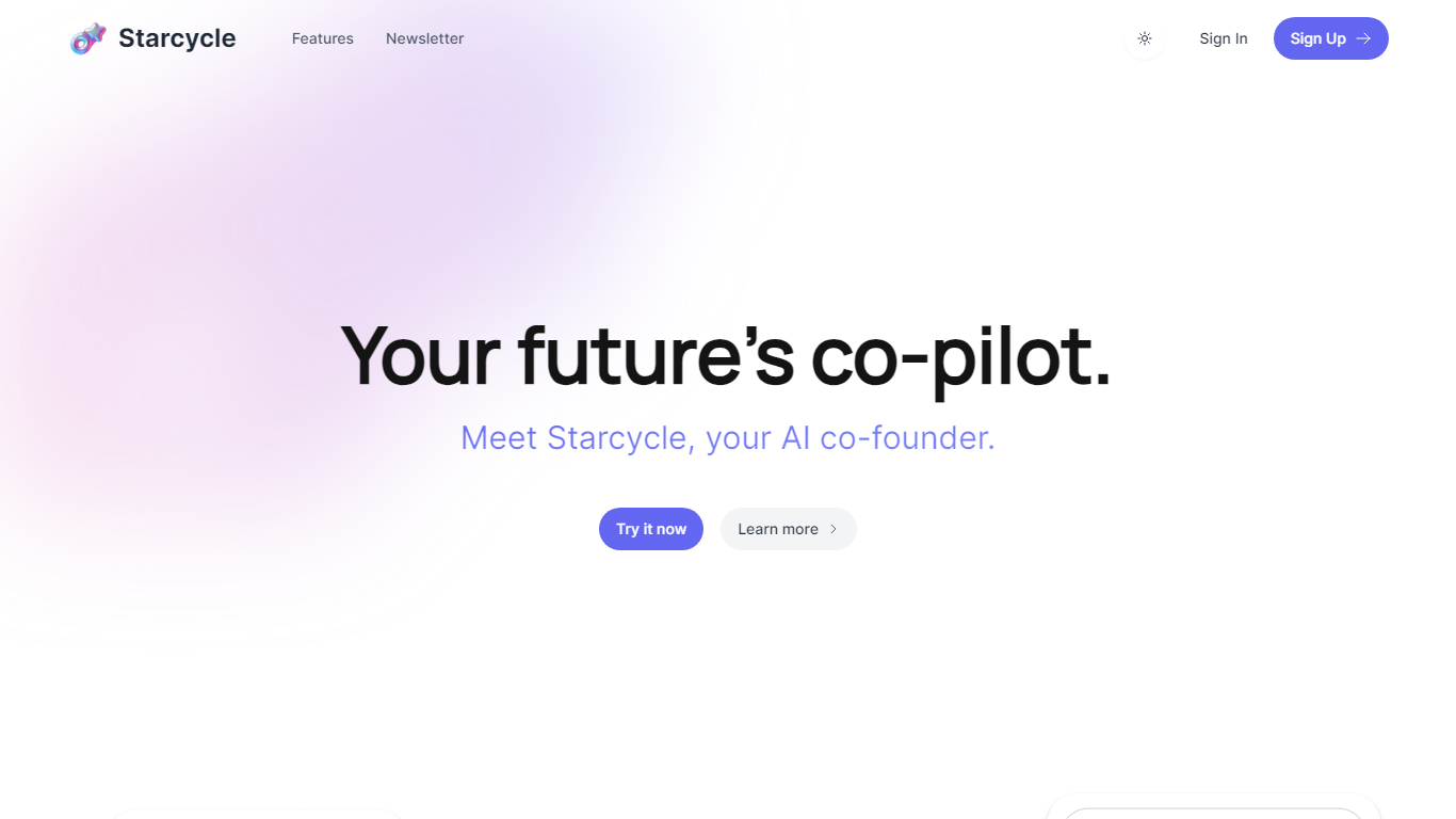 Embark on your entrepreneurial journey with Starcycle, the AI co-founder designed to amplify your business success. Starcycle offers a suite of AI-powered tools tailored to enhance your founder experience, all conveniently located in one dynamic hub. Jumpstart your big idea with AI-assisted planning, including market overviews, projections, and SWOT analyses, making it easier than ever to lay the groundwork for your venture.